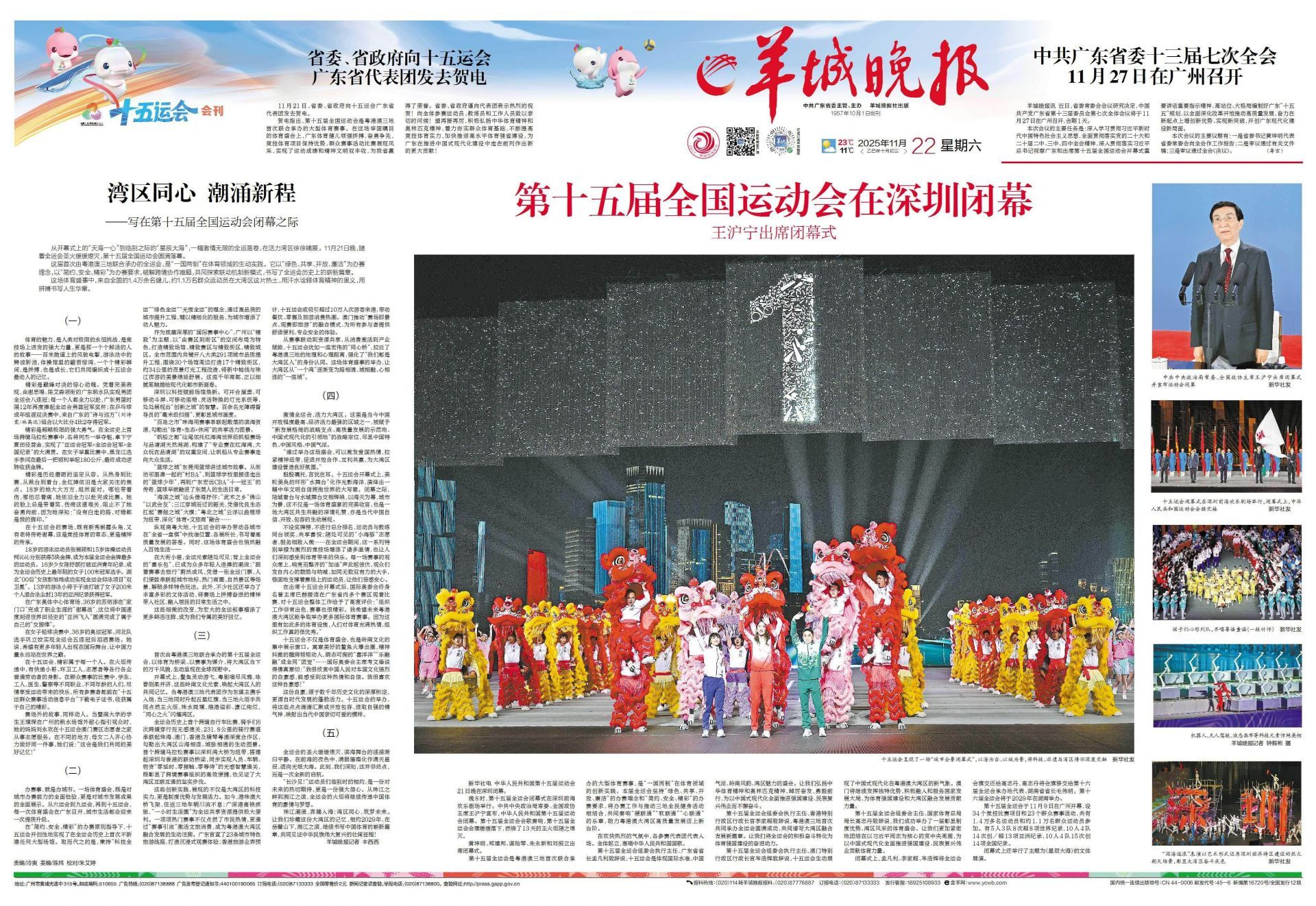 11月22日,《羊城晚报》头版来自《离别中的星辰大海》开幕式《天海合一》。一幅全运会激情无限的画卷正在充满活力的湾区徐徐展开。 11月21日晚,随着全运会圣火缓缓熄灭,第十五届全运会胜利落下帷幕。这是首届粤港澳三地联合主办的全国性运动会。这是“一国两制”在体育领域的生动实践。以“绿色、共享、开放、廉洁”为游戏运营理念,以“简单、安全、无序”为运营要求,解决跨界合作问题,共同探索机制环节新模式,谱写国运历史新篇章。在这场体育赛事中,来自全国各地的14000多名运动员和约11000名群众运动员用汗水定义了运动的意义在大湾区这片热土上,用艰苦奋斗书写人生篇章。第十五届全运会呈现“城市全景闭幕式”,以大海为平台,以城市为景观,将科技、非物质文化遗产和湾区情怀深度融合。图片/羊城晚报记者钟振斌 摄(一)体育之美,是人们对极限的永恒挑战,是赛场上爆发的强大能量,是每一个活着的人的故事——百米跑道上的闪电速度,游泳池里的波浪,体育馆里的曼妙风姿,每一个令人惊叹的时刻,艰难的发展和成长,广大体育馆,每一个令人惊叹的时刻,都是艰难的发展,体育馆的发展,每一个精彩的时刻,艰难的发展,发展的过程,他们的思考都在体育馆里。第十五届全运会。精彩就是巅峰秀的快感向下。凭借完美表现,谢思震、陈艾森领衔的广东跳水队实现国家队八连冠;大家全力以赴,广东男篮时隔12年捧起全运会男篮冠军奖杯;成人网球混双榜上,来自广东的“诗与远方”(刘诗文/林高远)组合以4比2的大比分夺得冠军,令人印象深刻的是卢布超越极限的强大实力。在全运会历史上首个跨界马拉松赛事中,著名运动员何洁夺得宁夏田径首枚金牌,实现“亚运冠军+全运冠军+全国纪录”的大满贯。女子举重比赛中,黑龙江选手李艳在最后一举成功举起180公斤,最终成功逆转夺得金牌。令人惊奇的是稳定性和可靠性克服困难的心态。从热身到比赛,从站台到看台,全红婵依然是大家关注的焦点。 18岁的他,为人大方,处事冷静。即使带着伤病,他仍然竭尽全力完成比赛。他的脸上始终挂着笑容,贫穷的伤痛也不能阻止他勇往直前,因为他知道:“没有一条路是白走的,我所有的脚步都是对与错。”颁奖典礼结束后,全红婵激动地亲吻金牌,并晒出了与“喜羊羊”/羊城晚报记者梁宇的亲密合影,第十五届全运会,既有新秀新秀,也有老将传奇落幕。这是竞技体育的标准,也是精神的传承。 18岁的游泳运动员张占硕和15岁的体操运动员柯勤勤各获得5枚金牌,成为本届奥运会上获得金牌最多的运动员。他的全国运动会。 16岁的陈玉洁打破亚洲青少年纪录,成为全运会历史上最年轻的女子100米冠军。湖北“00后”姑娘彭旭伟在全运会上成功实现仰泳项目“双卫”;13岁游泳运动员于子迪在200米个人混合泳中打破13年之久的亚洲纪录并夺得冠军;在广东奥体中心体育场,36岁的苏冰苏炳添“在家”完成了职业生涯的收官,雕刻出速度的“亚洲飞人”世界田径赛跑完男子4×100米接力决赛,苏炳添接过最后一棒 图/羊城晚报 摄 在女子铅球决赛中,36岁的河北奥运冠军巩立姣在获得全运会第五个比赛冠军后泪流满面。让中国在第十五届全运会始终走在世界前列。 ,混沌属于所有人。在火炬传递中,有快递员、环卫工人、志愿者等各行各业的普通工作者。在群众性比赛中,学生、工人、医生、警察等各种职业、年龄的人们享受体育带来的快乐,所有参赛者都可以将电子证书下载到“第十五届全运会群众性赛事信息平台”,获得属于自己的精彩故事。暨南大学学生王朴臣在广州跳舞时。在体育运动场馆外耐心引导观众的同时,母亲刘永焕则在第十五届全运会澳门志愿者之家从事志愿服务副业。在不同的地方,母女俩一起努力做着同样的事情。他们说:“这将成为我们共同的美好回忆!” “(二)举办赛事是指举办一座城市。体育赛事不是举办既是对我市举办赛事能力的全面考验,也是对我市发展成就的全面展示。从第六届全运会到第九届全运会再到第十五届全运会,广东举办的每一项体育赛事都将为城市生活品质带来升级。实现全运史上首次“邻里无大片区域建设”的空间布局、色彩,打造美丽场所、特殊比赛场所、特殊街区、特殊城市。夜游滨海资源,构筑“体育+生态+休闲”的共享动态画卷。“首都”汕尾依托红湾世界帆船区和平清湖天然泻湖,打造“双城”空间。 “专业比赛在红湾,大众比赛在品清湖”,让帆船运动从专业赛事走向大众生活。讲述这座城市的故事。从邻居们聚集的“村巴”,到外出打拼对方篮球学校的“篮球男孩”,再到传奇的广东宏远CBA“十一冠”,篮球早已与东莞人结下了不解之缘。汕头,“海滨之城”,寄托海边的情怀; “武术之城”佛山,“以武为友”;韶关,三河穿城,高举生态优良的“赛艇之城”旗帜; “粤北名城”云浮,以曲棍球为纽带,深化“体育+文旅商业”融合……放眼南粤大地,十五运会的举办,推动各城市在“省赛”中找准定位、展现优势,书写高质量发展的答卷。体育赛事也悄然融入人们的生活——国运元素随处可见在街上;背着国赛的“福袋”,已经成为很多年轻人追求的潮流; “带着游戏去旅行”已经成为一种趋势。凭借一张全国游戏门票,人们可以连接城市地标、热门商圈、自然风景区等场景,解锁多种独特玩法。此外,许