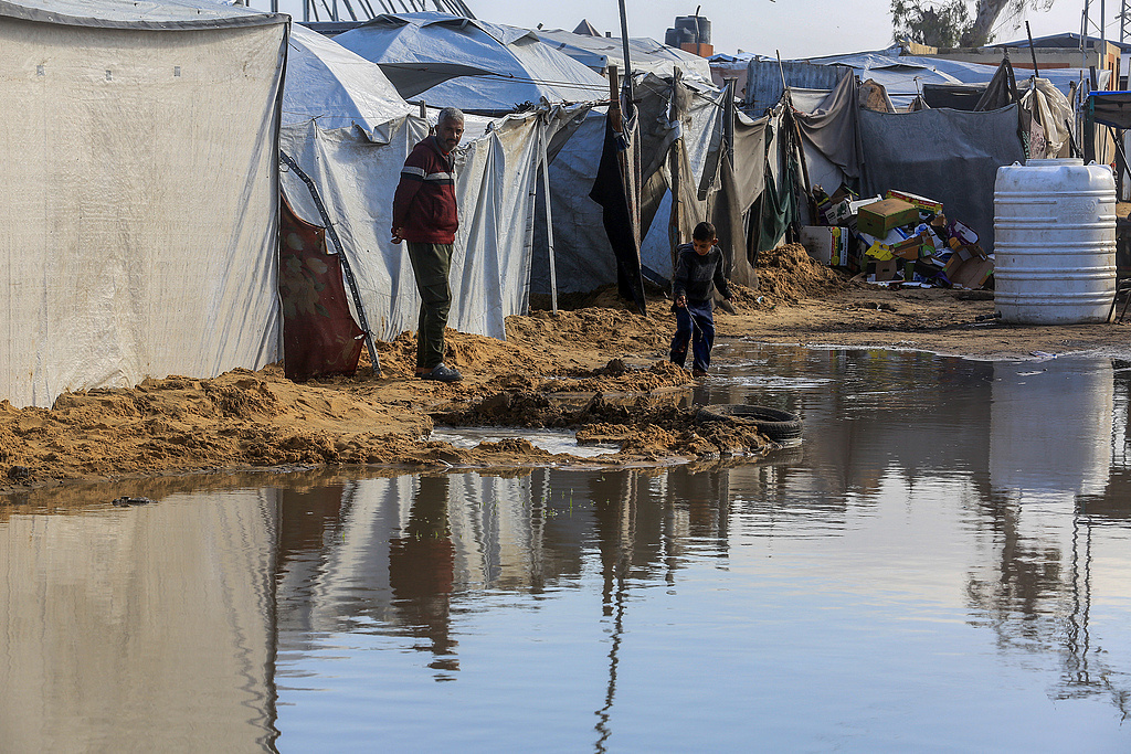 自13日夜间以来,加沙地带经历了入冬以来的第一场降雨。雨势多次加大,造成洪水泛滥。一些难民居住的帐篷营地被洪水淹没。