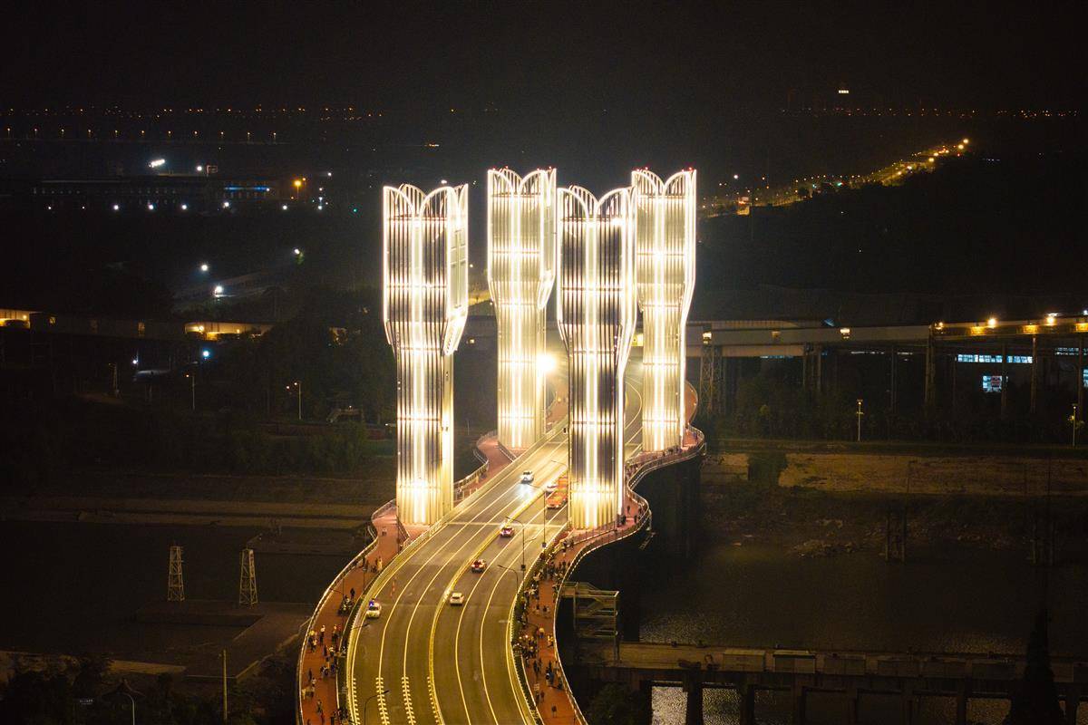 2025年11月8日晚,武汉第一电梯——位于武汉市青山区的右岸大道开口大桥灯火通明。大桥电梯的四根柱子在夜晚非常耀眼,吸引了不少市民打卡拍照。 10月31日,大桥正式通车。这座横跨武钢运河的大桥是华中地区第一座开放式桥梁。大桥高架部分长104米,高架桥最大宽度46.2米,最大起重能力27米,起重量2650吨。它智能平衡水路和陆路的运输需求。